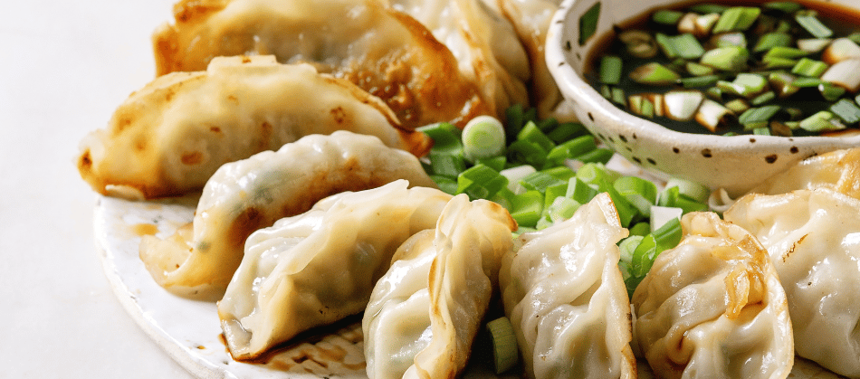 Handmade dumplings filled with seasoned pork and fresh vegetables.